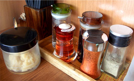 コショウ・一味・ラー油・醤油・酢・ニンニク。
