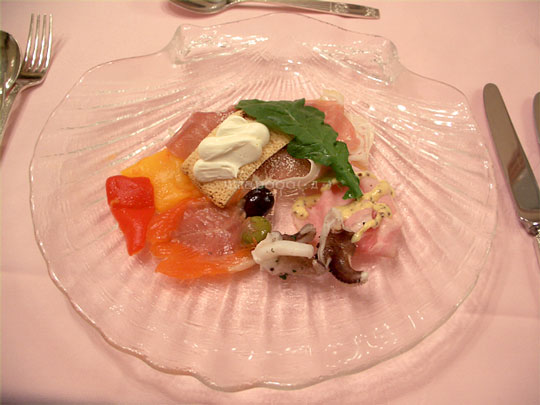 サーモン・生ハム・イカ・ハム・パプリカ・ラスク・オリーブ2種。