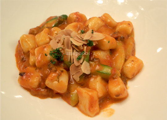 ニョッキは、トマトソースで、鶏肉・アスパラ・アーモンドスライスが使われています。