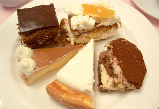 ミルフィーユ・チーズケーキ・チョコケーキ・プリンケーキ・ティラミス・ワインゼリー。